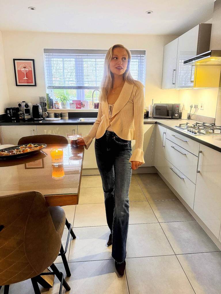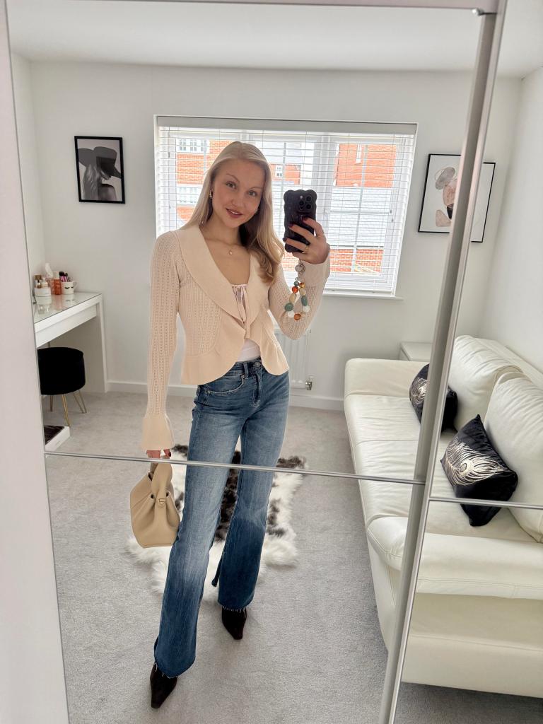 I went a little more casual with my fit on this day with a cute frill trim tie front cream cardigan, Stradivarius dark wash flared jeans, Topshop brown pointed toe boot heels, Heaven Mayhem statement gold earrings and my Polene Handbag for a touch of quiet luxury.