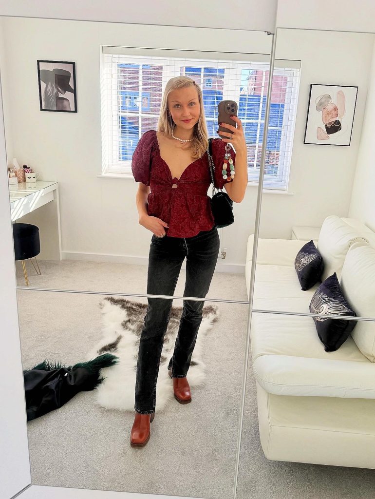 My outfit of the day was this stunning New Look maroon puff sleeve top which just screams Christmas Day vibes paired with my Zara black straight leg jeans, ASOS square toe boot heels, my Sandro green velvet handbag, and a beautiful new By Alona pearl necklace, another generous gift from my boyfriend.