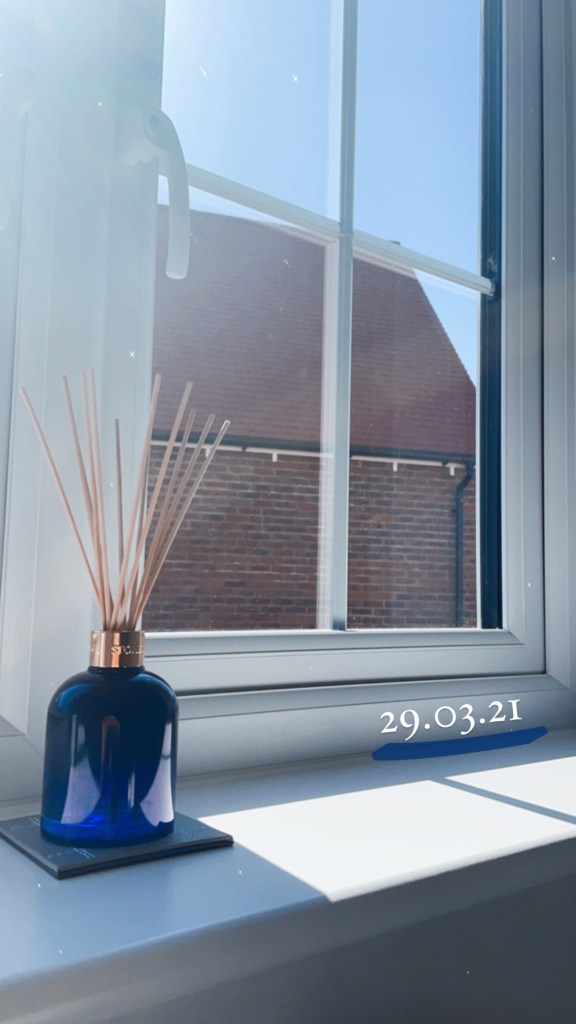 As for the rest of the house, it’s all a work in progress at the moment. Like with any new house and especially a new build, there is a lot to think about and it’s taken us to get in here and actually see the space, before finalising our furniture orders. We are still waiting for most of our bedroom furniture, so currently we are sleeping in the spare bedroom. The lounge is coming together too as we already had a nice big grey corner sofa and big TV of course, we’re just in need of a rug, some sort of cabinet and again we need to choose some nice pictures for the wall. I have already made use of the many candles and reed diffusers I had saved, this one from Stonewood is my favourite scent and the blue bottle looks great on the landing windowsill.