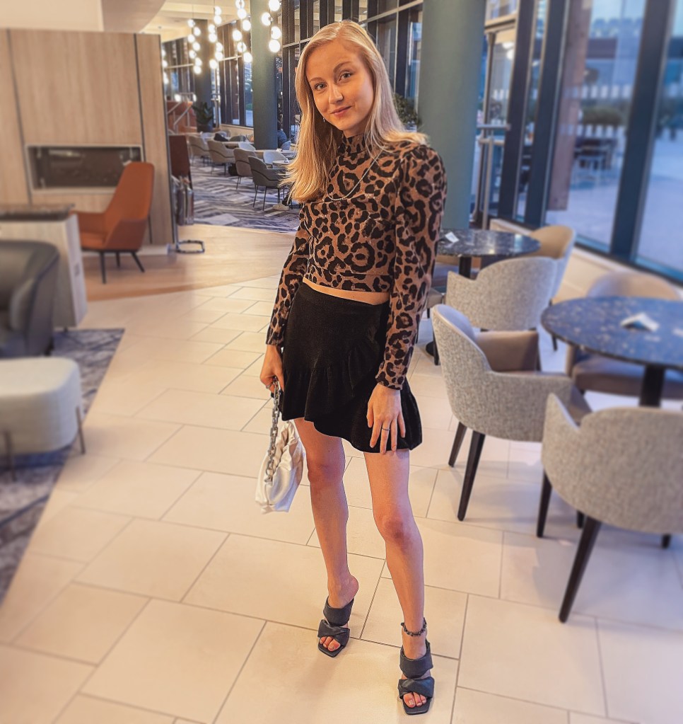After a steam in the sauna and dip in the pool, it was time to head back to the room and get ready for drinks and dinner. I felt like getting a little dressed up for our dinner date in this backless leopard print blouse, black wrap mini skirt and my gorgeous smoky blue square toe mules – the perfect opportunity to wear these towering stilettos as it was only room to bar in a matter of a few steps!
