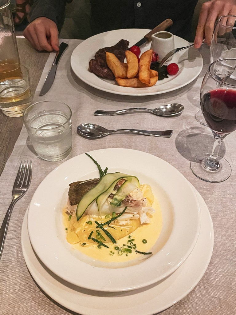For our main course I opted for the Cod Fillet on a bed of mash potato accompanied with samphire, cucumber spring onion and Verjus Beurre Blanc. This dish was absolutely exquisite and cooked to perfection, I couldn’t fault it. My boyfriend also really enjoyed his classic Sirloin Steak with cherry tomatoes and triple cooked chips.