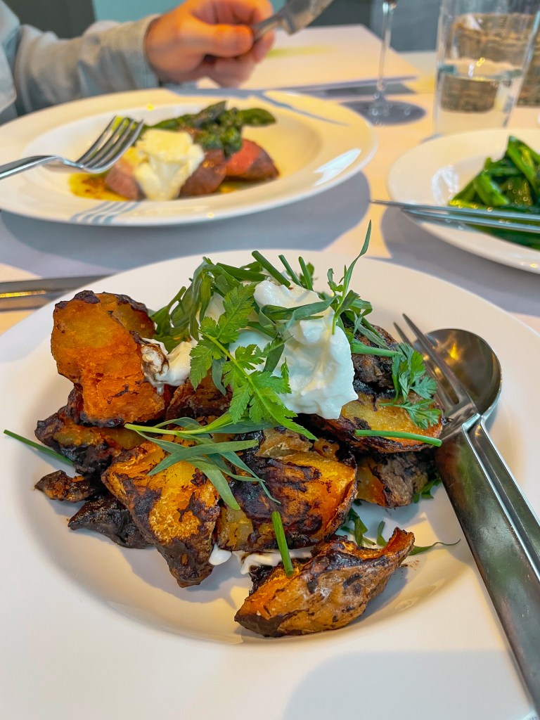 To accompany our mains we had the farm greens and these incredible crispy potatoes with black garlic vinaigrette, sour cream and herbs.