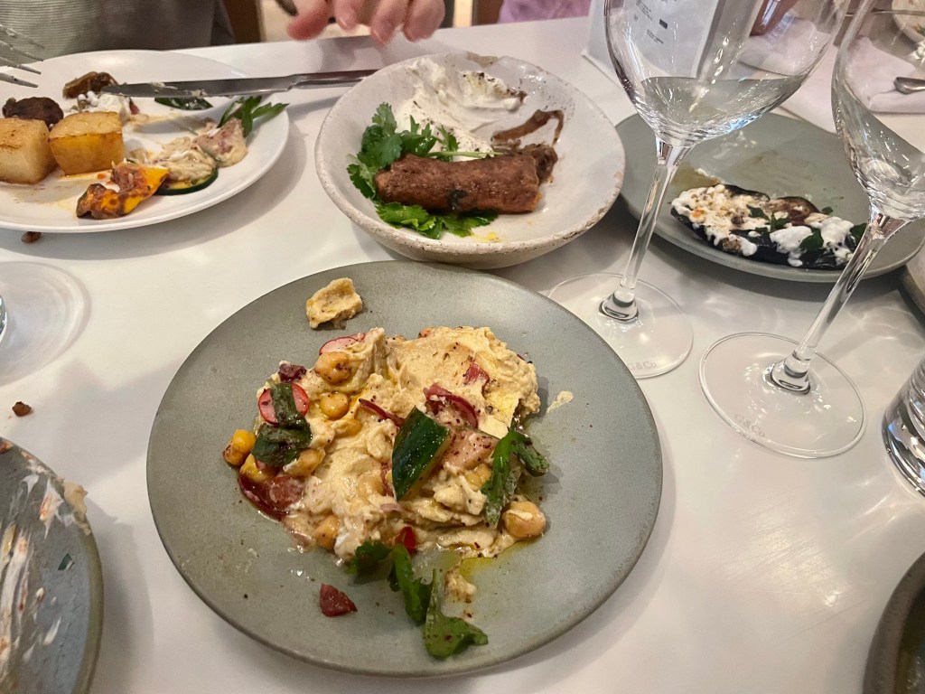 As I expected, the dinner was a mezze of small sharing plates including hummus, roasted vegetables, sea bream fillet and lamb koftas. The courgettes served with labneh, harissa tomato salsa and pine nuts was my favourite dish, accompanied with plenty of the hummus of course.
