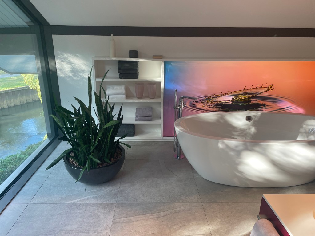 We were given a tour of the Huf Haus featuring my dream walk in wardrobe setup and this stunning bathroom with a free standing bath tub.