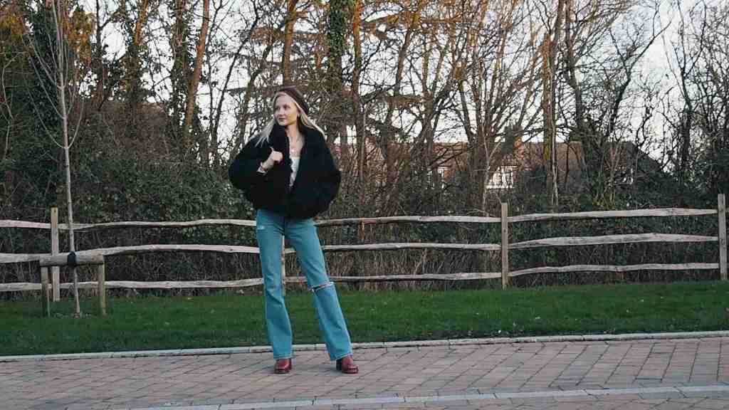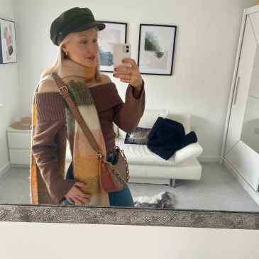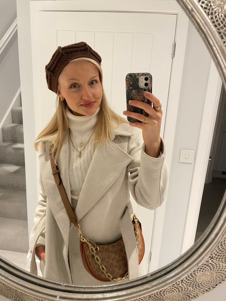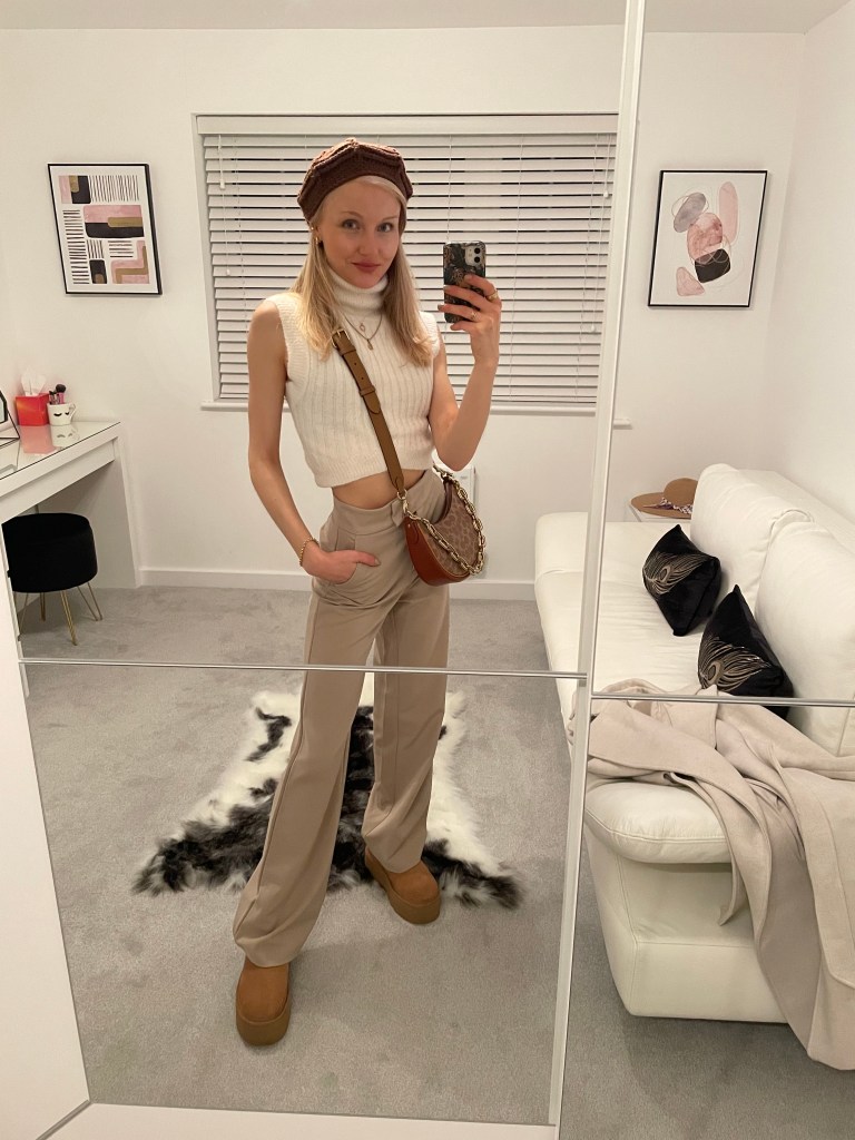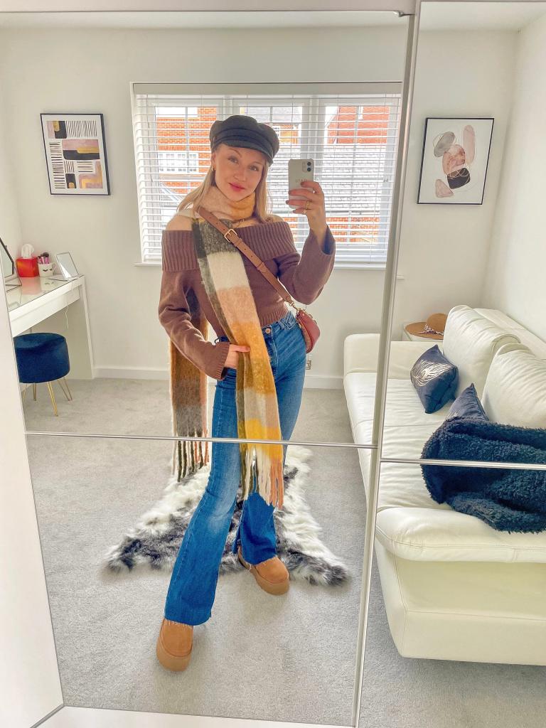 The shopping day cute and cosy look was a pair of Stradivarius blue flared jeans, an off shoulder brown jumper, my platform Ugg boots, an earthy tone wool scarf which I got for my Birthday, my Coach signature print cross body bag, a faux fur black Ugg coat and my favourite khaki baker boy hat from Mango.