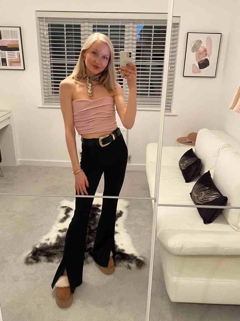 My Birthday fit was a pair of flared tailored black trousers from Zara, a dusty pink bandeau also from Zara, my silk Le Scarf neckerchief, a cropped nude cardigan with gold buttons, my ASOS lace up maroon heels, plenty of gold jewellery to accessorise, a vintage Jaegar green oversized blazer to keep me warm and my Sandro velvet green handbag to complete the look.