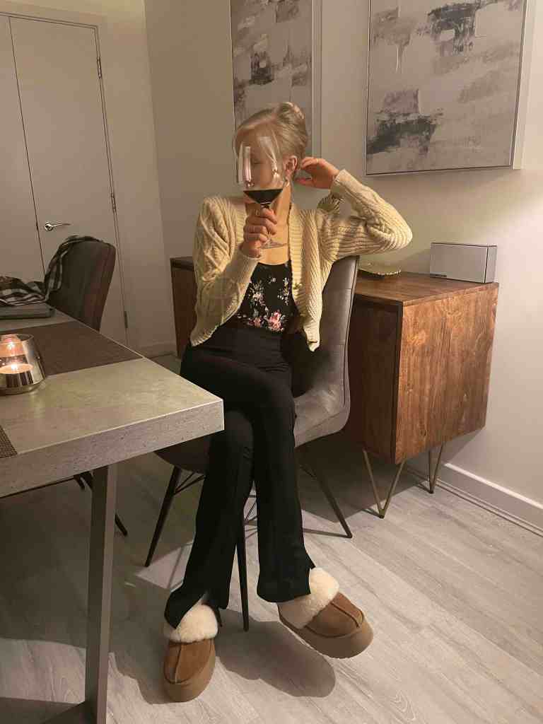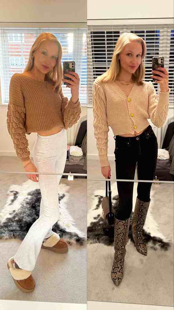 For my daytime look when working from home on Friday, I kept it very comfy and casual with a pair of grey flare leggings which I picked up in Primark this week and I’m loving, so now I’m keen to get a good quality pair from Alo or Tala. I then wore this camel knit jumper with cute backless detail and my Ugg platform slippers to complete the cosy fit.