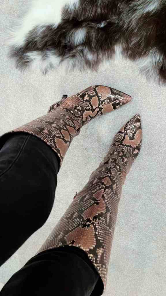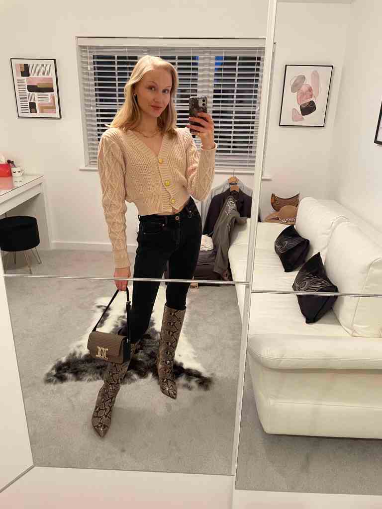 To meet friends for drinks at the pub that evening, I changed into my Neuw black denim jeans tucked into these killer snake skin long boots, which I toned down with a simple knitted nude boxy fit cardigan with gold buttons. An oversized long grey trench coat from Na-kd kept me warm and dry from the rain.