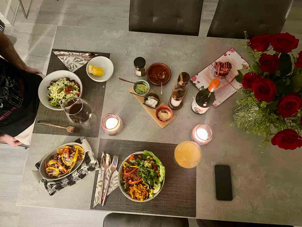It was midweek Mexican night, so we made our favourite burrito bowls with a side of chilli cheese nachos and all the dips of course. A bottle of red wine, candles lit and dinner served, we felt like we were in our own restaurant.