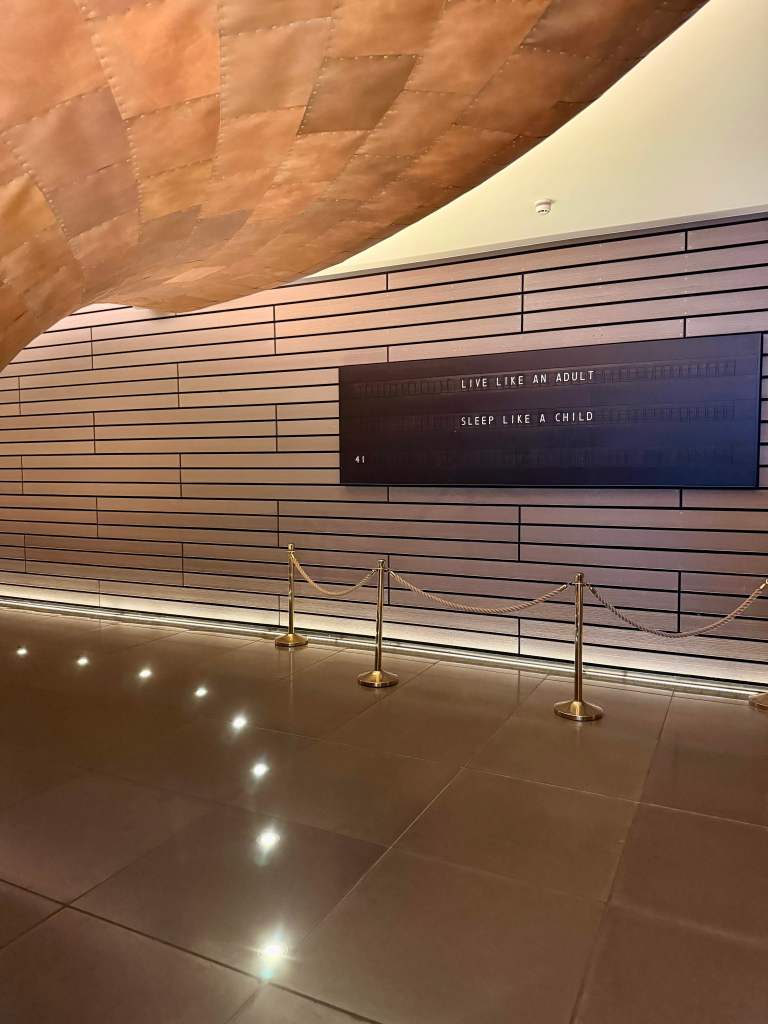With a design reminiscent of a 1920s transatlantic cruise liner, details like the statement anchor in reception and the copper wall feature reflect this nautical style. I particularly liked the inspiring quote wall display which changes every hour.