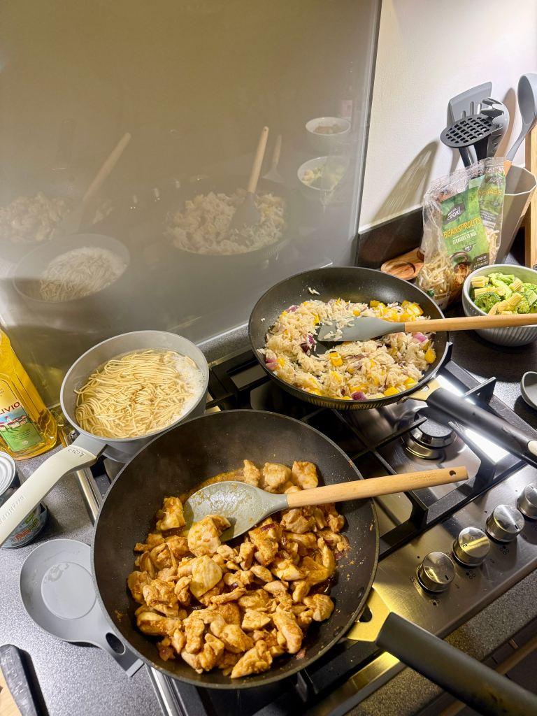 I fried off chicken thigh pieces with some onion before stirring through the laksa sauce paste and letting it all cook through. The other sauce was a chicken stock which I stir fried into the cooked rice along with some chopped onion and yellow pepper.