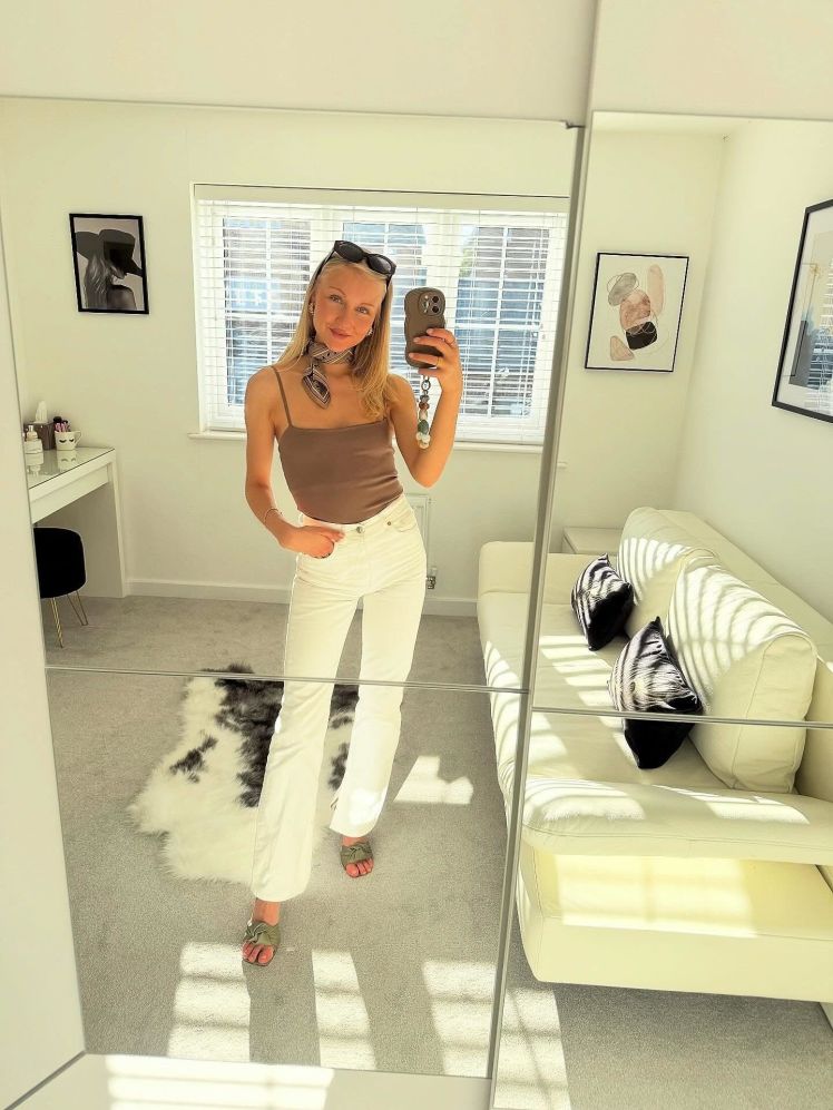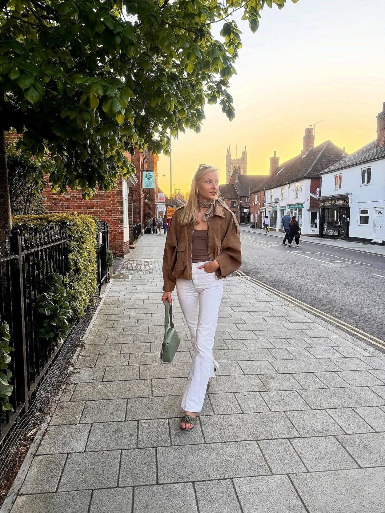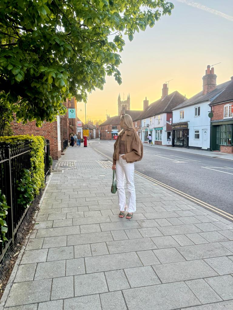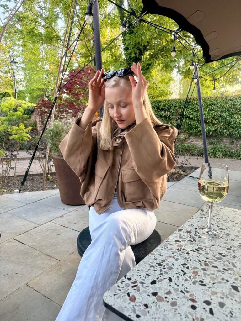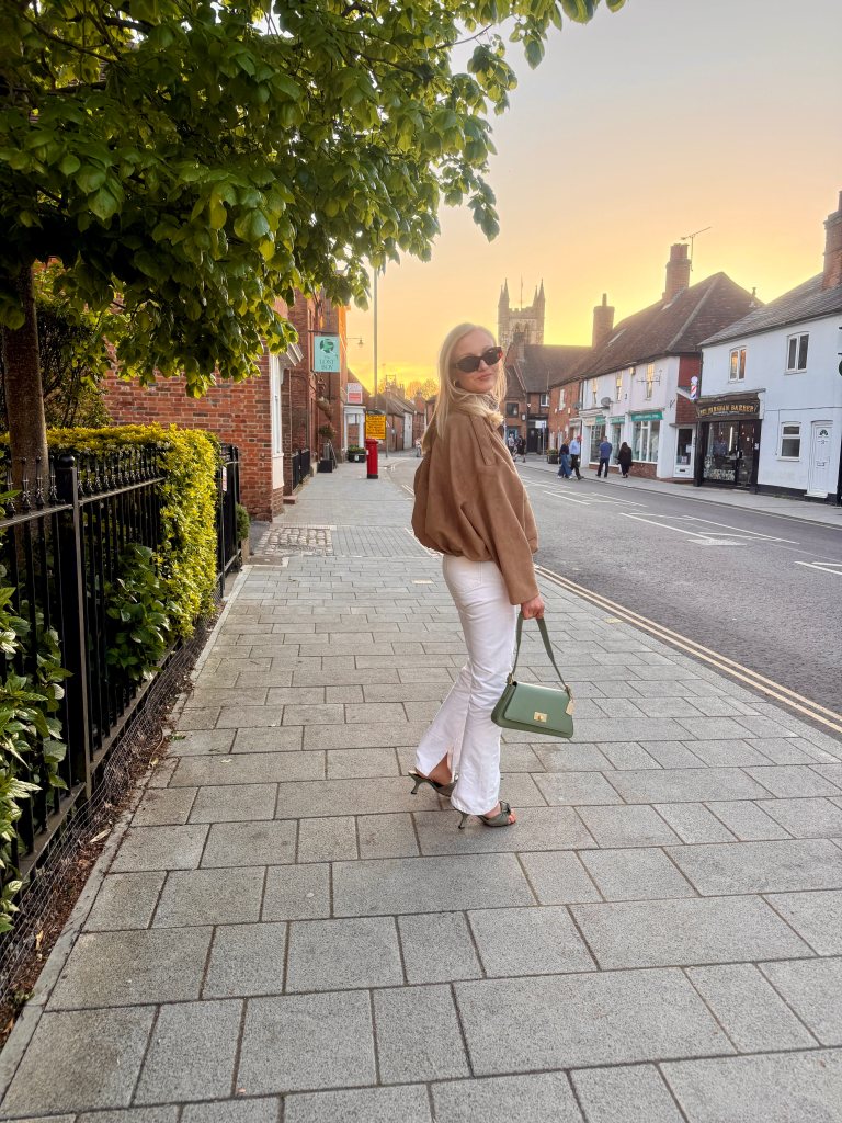 I wore my new spring/summer suedette oversized bomber jacket from Stradivarius with white jeans from Mango, paired with my brown strappy top from C’est Normal and khaki mule heels from Next.