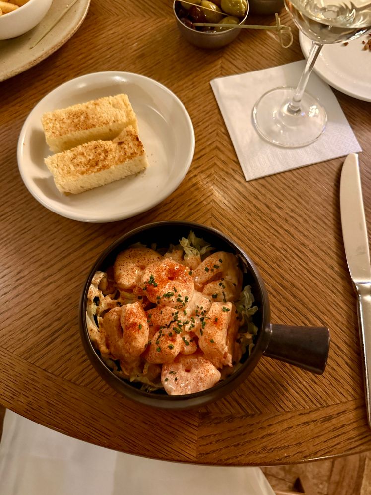 After some complimentary nibbles with our aperitif, I opted for a classic prawn cocktail served with brioche soldiers, while my boyfriend went for the BBQ chicken burger and fries.