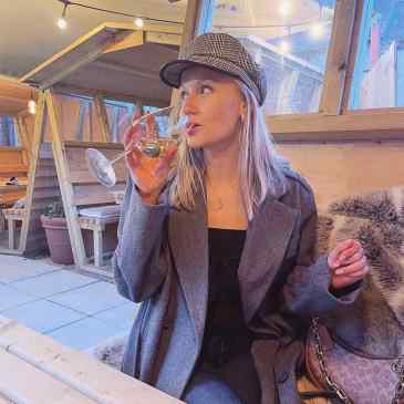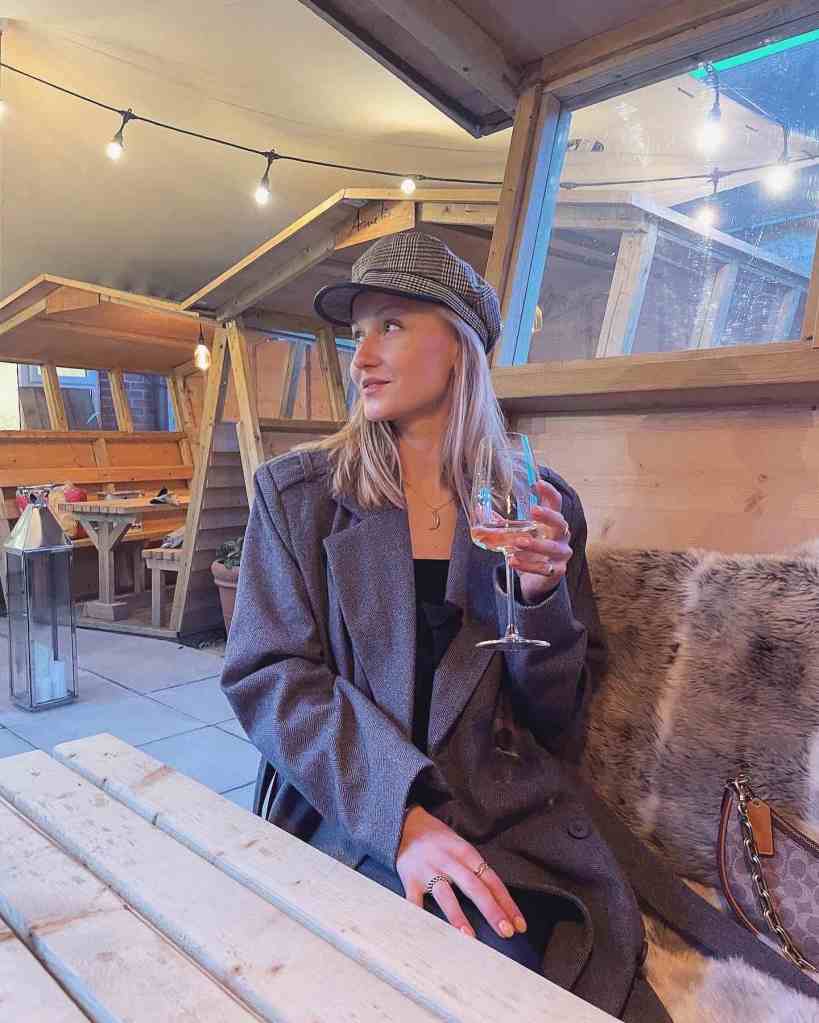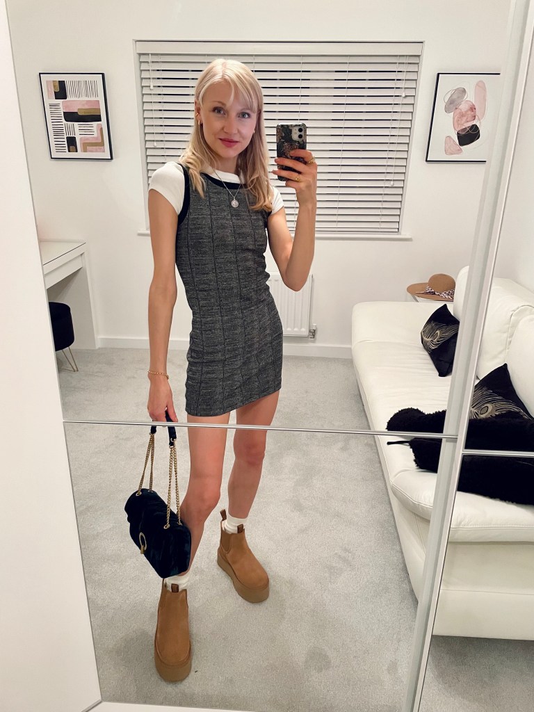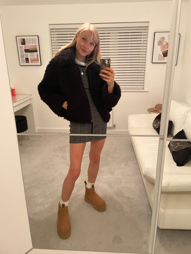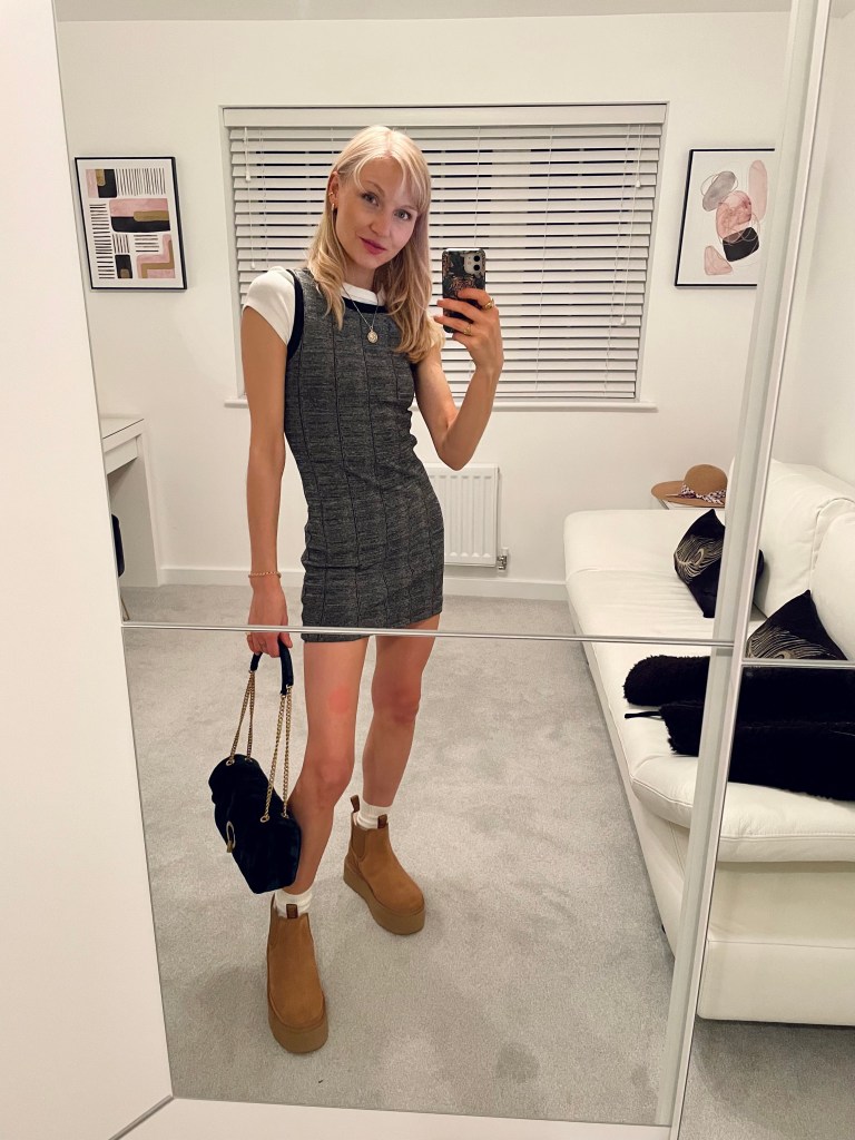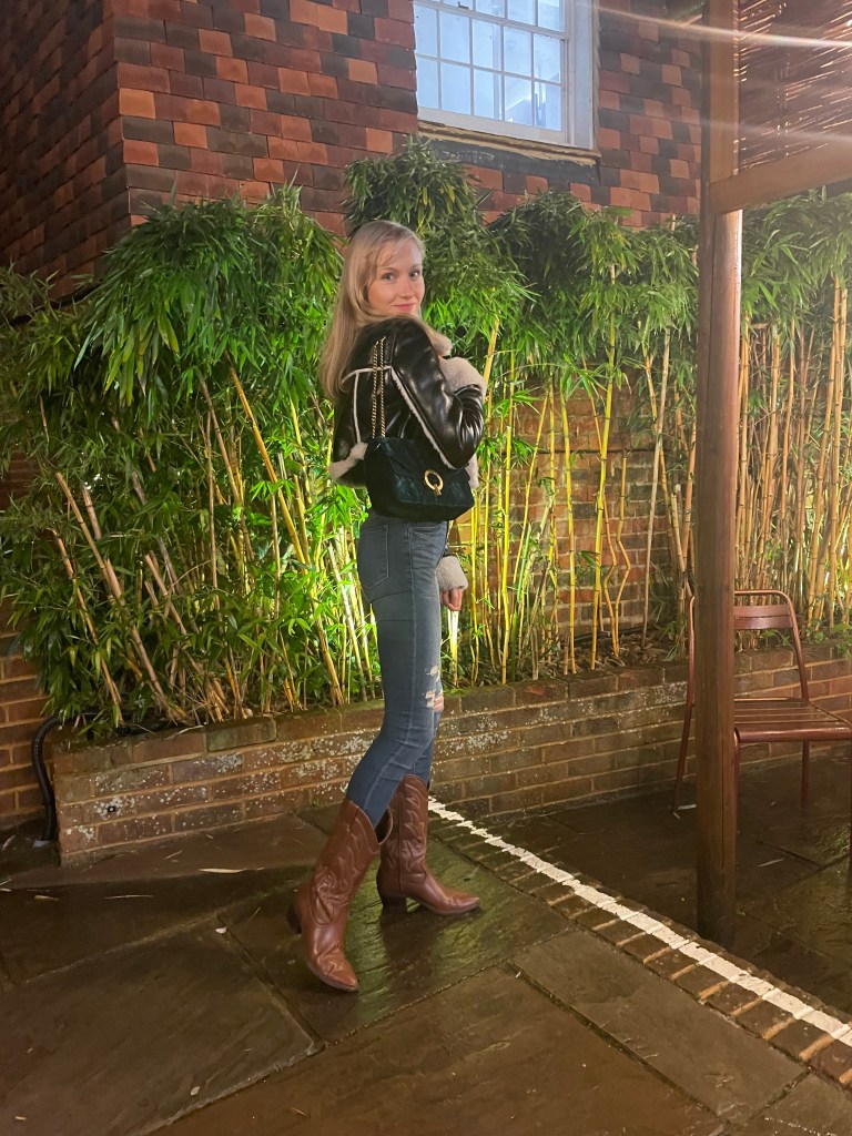 I did a quick outfit change just before dinner too, slipping into a cute brown mini dress paired with matching heels, my oversized Jaeger blazer, and my emerald-green velvet Sandro handbag.
