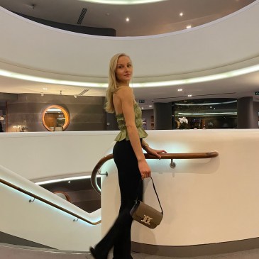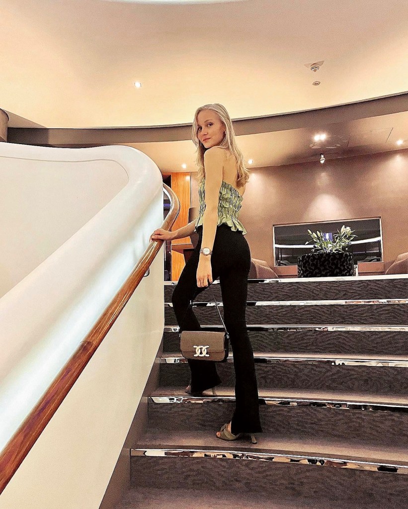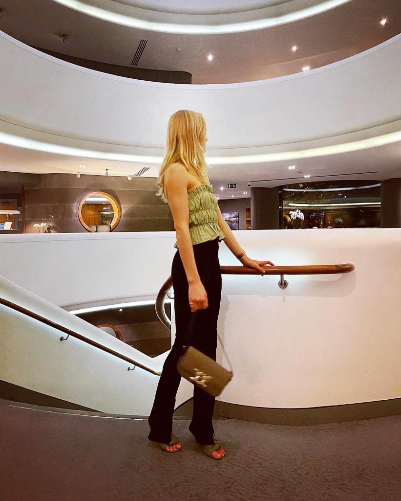 Upon every visit to the Sky Bar, I can never resist an outfit photo on their iconic spiral staircase. On this occasion I wore my green ruffle bandeau top, black split hem flared leggings, green knotted mules styled with my cute little gingham shoulder handbag and usual gold jewellery to complete the look.