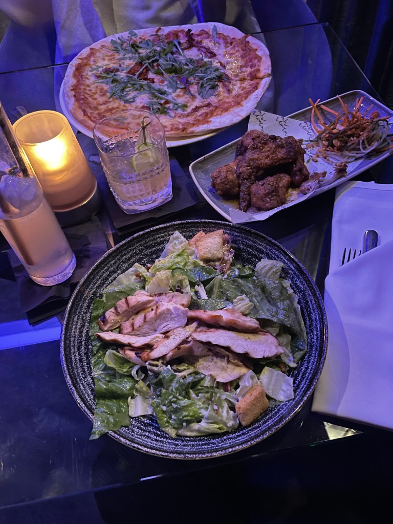 Whilst there is a brasserie in the hotel which we’re yet to try, they also serve food in the Sky Bar offering a varied selection of starters, salads, burgers, pizzas and other classic British dishes. I was craving a simple chicken Caesar salad, whilst my boyfriend opted for a Margarita pizza and honey drizzled chicken wings. Everything was delicious especially the honey wings, but there’s a number of other tasty looking salads on the menu which I’ll have to try next time, including a Mexican style rice salad or poke bowl, both right up my street!