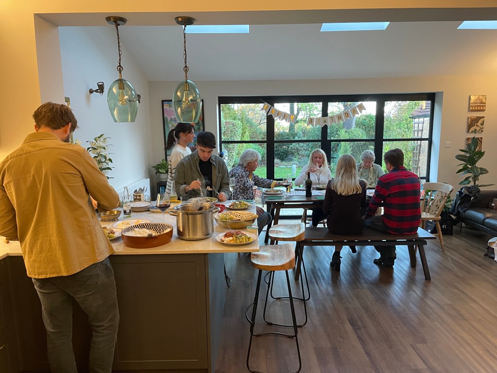For my Mum’s birthday celebrations on the 6th November, we went over to my brother and his wife’s gorgeous newly renovated house in Bromley. They have a wonderful entertaining space there now with an open plan dining kitchen area finished with touches of Scandi style furniture and details; I particularly love the deep fern green kitchen cupboards and marble work top.