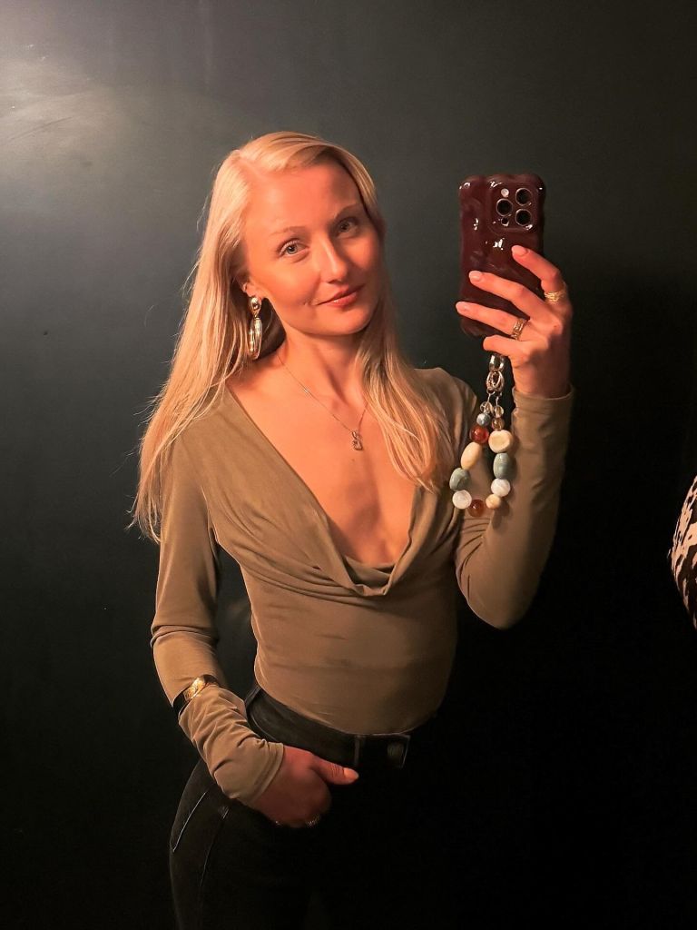For the evening look I went for effortless glam: my new deep olive green Motel top with a plunging neckline, paired with black flared jeans from Stradivarius, brown pointed Topshop boot heels, and statement gold earrings.